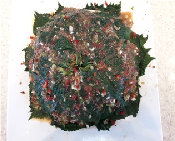 〔만드는법〕 ➀ 깻잎을 타래로 만들어 삶는다.