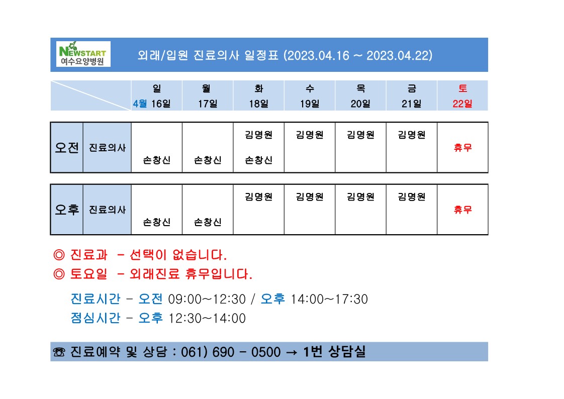 외래/입원 진료의사 일정표(2023.04.16~2023.04.22)