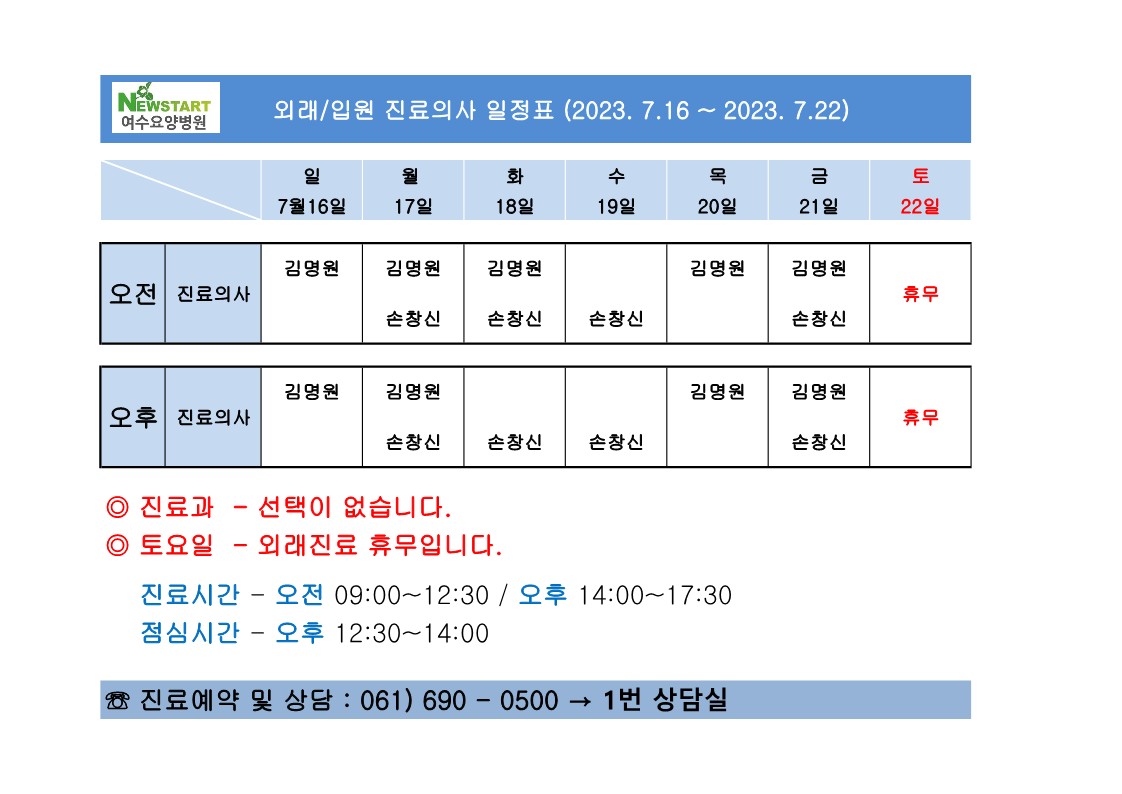 외래/입원 진료의사 일정표(2023.07.16~2023.07.22)