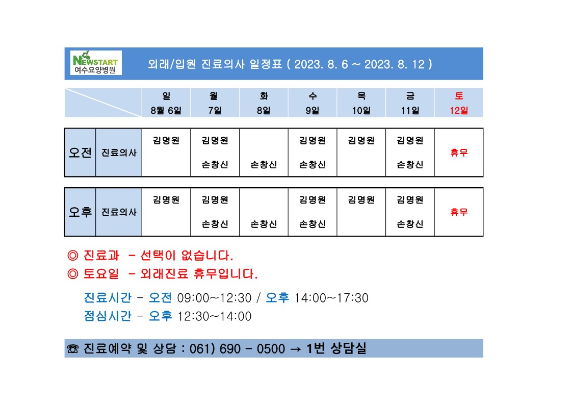 외래/입원 진료의사 일정표(2023.08.06~2023.08.12)